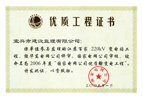 220KV國(guó)家電網(wǎng)優(yōu)質(zhì)工程證書